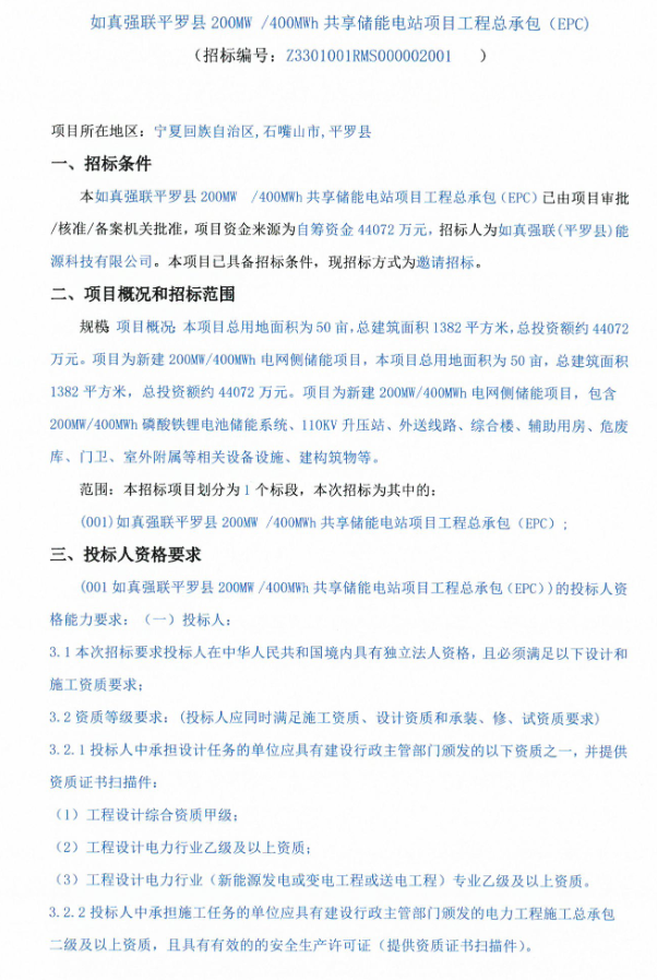 北极星储能网获悉,9月29日,如真强联平罗县200MW/400MWh共享储能EPC招标,项目位于宁夏石嘴山,项目资金来源为自筹资金44072万元,约合1.1018元/Wh。本项目总用地面积为50亩,总建筑面积1382平方米。项目为新建200...