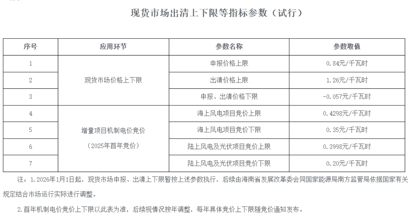 9月26日,海南省发展和改革委员会发布关于印发《海南省深化新能源上网电价市场化改革实施方案》的通知,文件提到,2026年1月1日起,全省新能源(所有风电、太阳能发电,下同)项目上网电量全部进入电力市场,上网电价通过市场交易形成。新能源项目参...