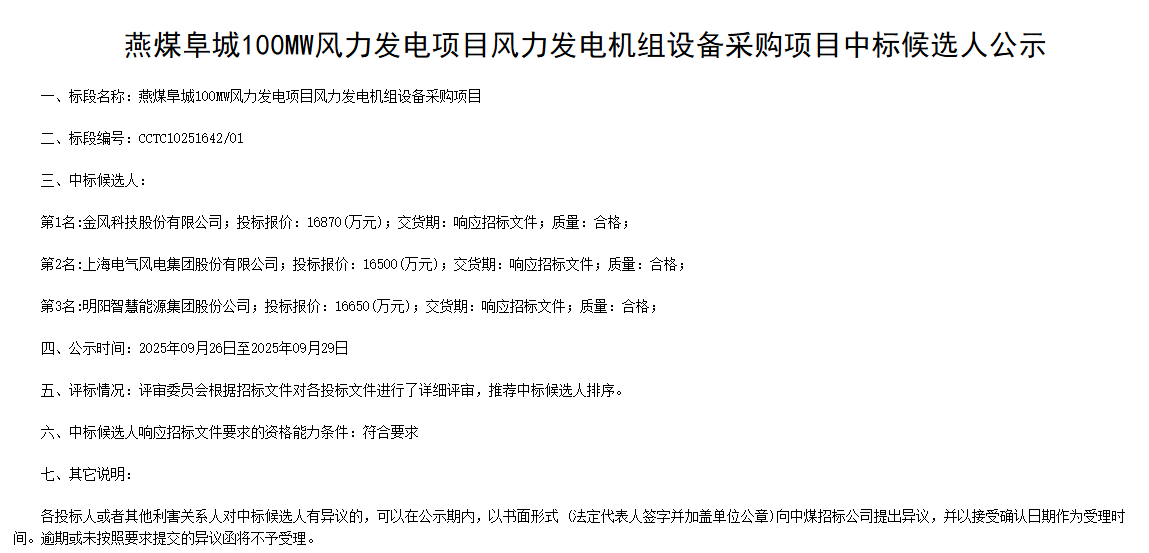 北极星风力发电获悉,近日,燕煤阜城100MW风力发电项目风力发电机组设备采购开标,金风科技为第一中标候选人,报价1.687亿元。据悉,该项目位于河北省衡水市阜城县西南部,投资主体为河北燕煤新能源有限公司。本项目建设规模100MW,经《河北省...