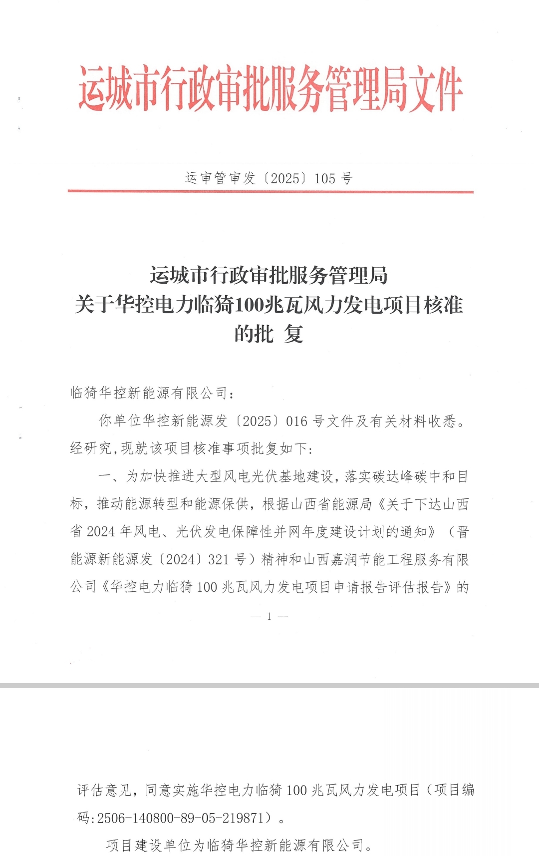 9月23日,临猗华控新能源有限公司位于山西省运城市临猗县的100兆瓦风电项目获得运城市行政审批服务管理局核准批复。该项目规划新建8台6.25MW风力发电机组和10台5MW风力发电机组及相关配套设施,配套建设一座220kV升压站。建成后,预计...
