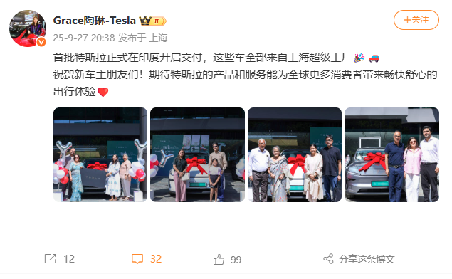 北极星储能网获悉,9月27日,特斯拉公司副总裁陶琳宣布,首批特斯拉正式在印度开启交付,这些车全部来自上海超级工厂。据了解,今年7月,特斯拉在印度的首家展厅正式开业,这标志着特斯拉正式进入印度市场。展厅位于孟买的班德拉库尔拉综合体,面积达40...