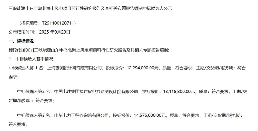 9月29日,三峡能源山东半岛北海上风电项目可行性研究报告及其相关专题报告编制中标候选人公示。公告显示,第一中标候选人:上海勘测设计研究院有限公司,投标报价:12,294,000.00元。第二中标候选人:中国电建集团福建省电力勘测设计院有限公...