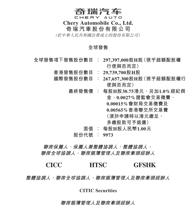 北极星储能网获悉,9月25日,奇瑞汽车股份有限公司正式登陆港交所。此次上市,奇瑞汽车以30.75港元/股的招股价上限定价,募资规模达91.4亿港元,成为年内港股市场规模最大的车企IPO。本次IPO中,奇瑞发行约2.97亿股H股。其中,香港公...