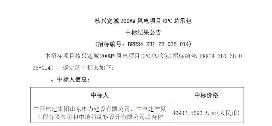 核兴宽城200MW风电项目EPC总承包中标结果公告核兴宽城200MW风电项目位于河北承德宽城满族自治县下属各乡镇行政村,主要有板城镇、龙须门镇、大字沟乡、苇子沟乡、亮甲台镇。本项目建设规模为200MW,拟安装32台单机容量为6.25MW的风...