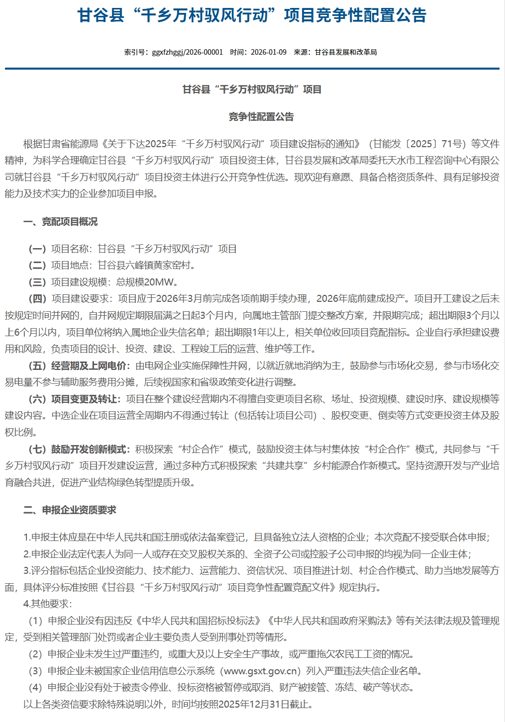 北极星风力发电网获悉,近日,《甘肃天水市甘谷县“千乡万村驭风行动”项目竞争性配置公告》公布。根据公告,甘谷县“千乡万村驭风行动”项目位于甘谷县六峰镇黄家窑村。项目总规模20MW。项目建设要求:项目应于2026年3月前完成各项前期手续办理,2...