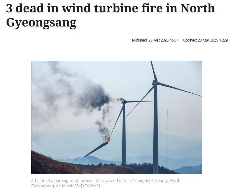 据外媒报道,当地时间2026年3月23日(周一)下午1时11分许,韩国庆尚北道盈德郡一处风力发电场发生严重火灾事故,造成现场3名工作人员死亡。事发时,3名工人正在对19号风力发电机的叶片中部进行检查与维修作业,火灾突然发生。燃烧的叶片从高处...