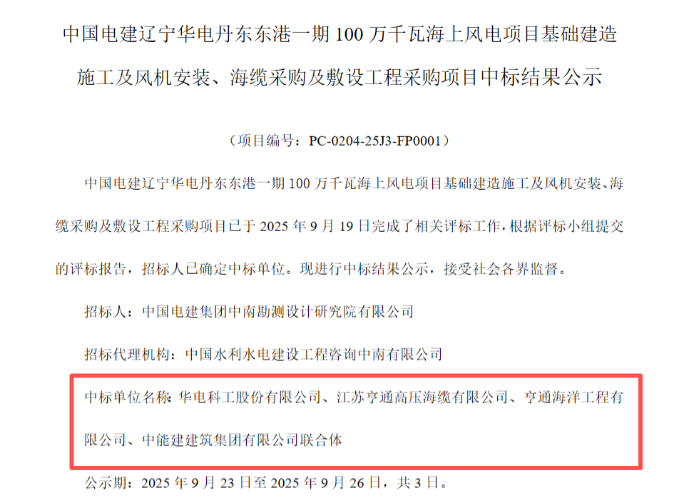 9月23日,中国电建辽宁华电丹东东港一期100万千瓦海上风电项目基础建造施工及风机安装、海缆采购及敷设工程采购项目中标结果公示。公告显示,中标单位为华电科工股份有限公司、江苏亨通高压海缆有限公司、亨通海洋工程有限公司、中能建建筑集团有限公司...