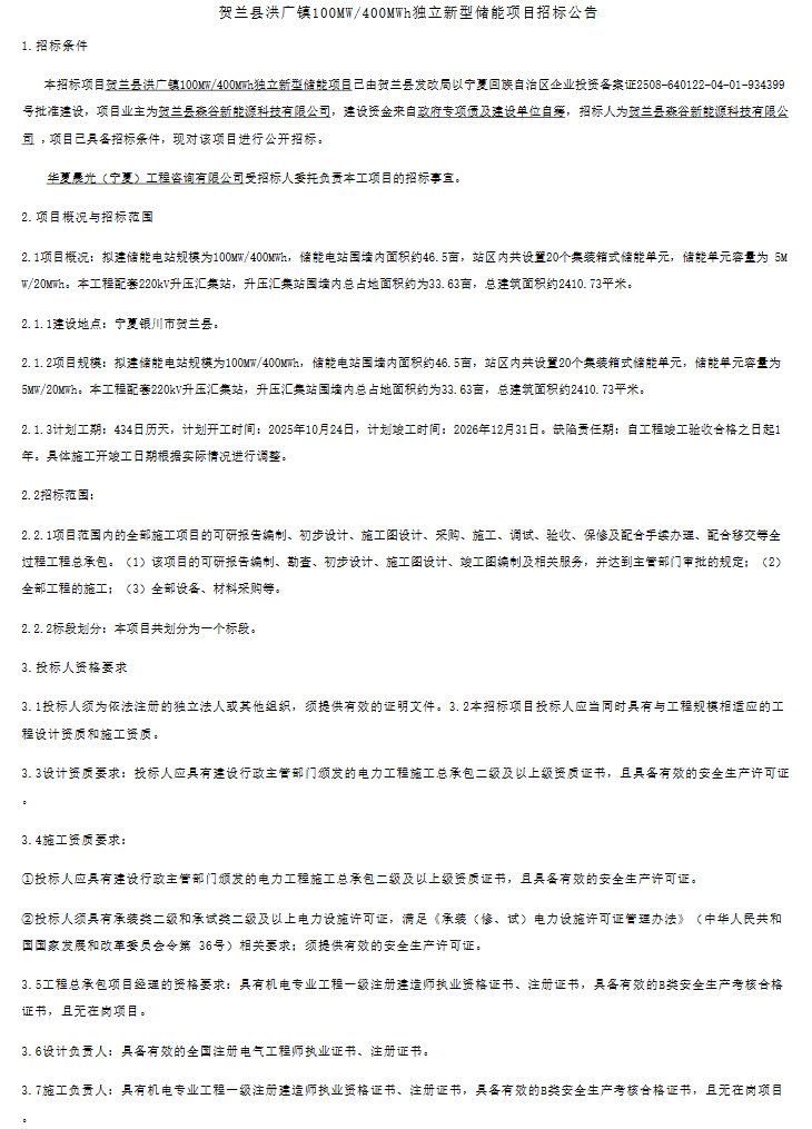 北极星储能网讯:9月22日,贺兰县森谷新能源科技有限公司发布贺兰县洪广镇100MW/400MWh独立新型储能项目EPC招标公告,项目建设地点宁夏银川,项目建设资金来自政府专项债及建设单位自筹。据了解,贺兰县森谷新能源科技有限公司为国有企业。...
