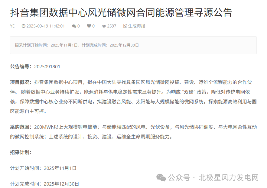 近日,抖音集团数据中心项目启动合作伙伴招募,拟在中国大陆寻找具备园区风光储微网投资、建设、运维全流程能力的企业,核心采购范围涵盖风电设备在内的多类能源系统及服务,旨在通过风光储微网建设,破解数据中心能源消耗与供电稳定性难题,同时响应“双碳”...