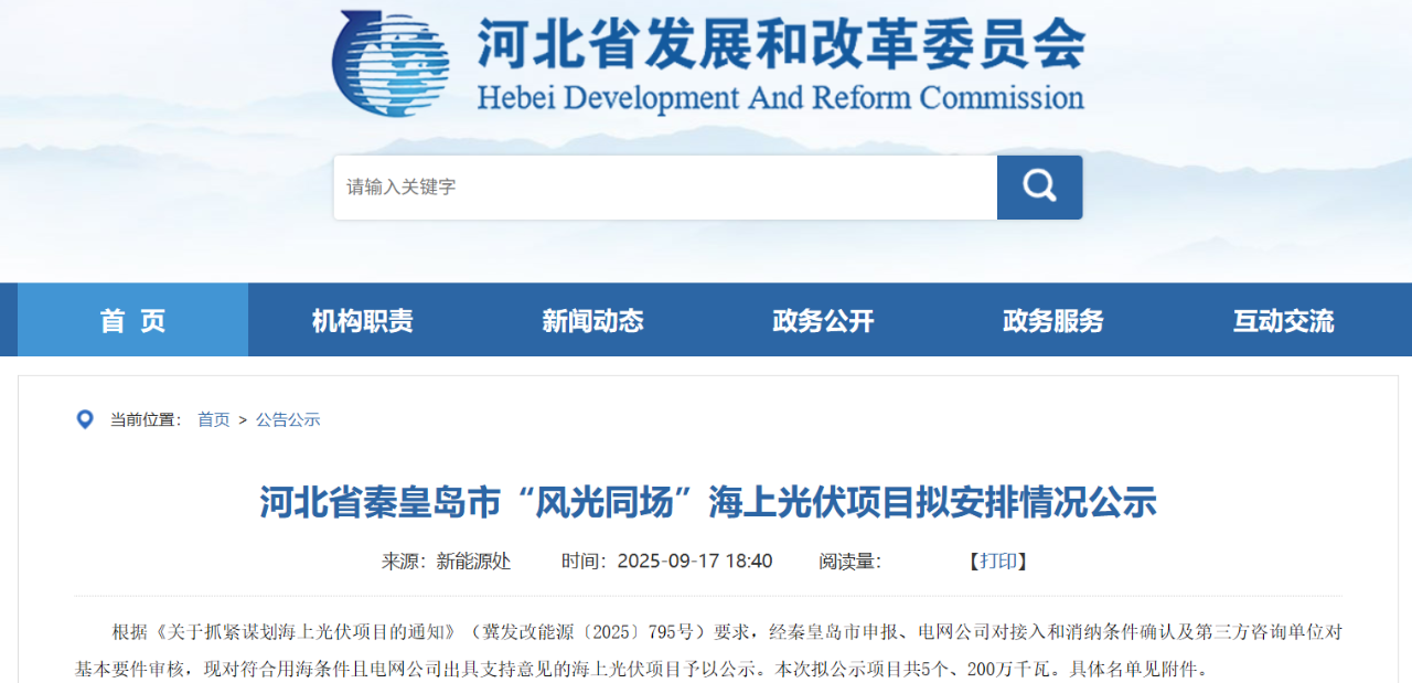 9月17日,河北省发展和改革委员会发布《河北省秦皇岛市“风光同场”海上光伏项目拟安排情况公示》,对符合用海条件且电网公司出具支持意见的海上光伏项目予以公示。...