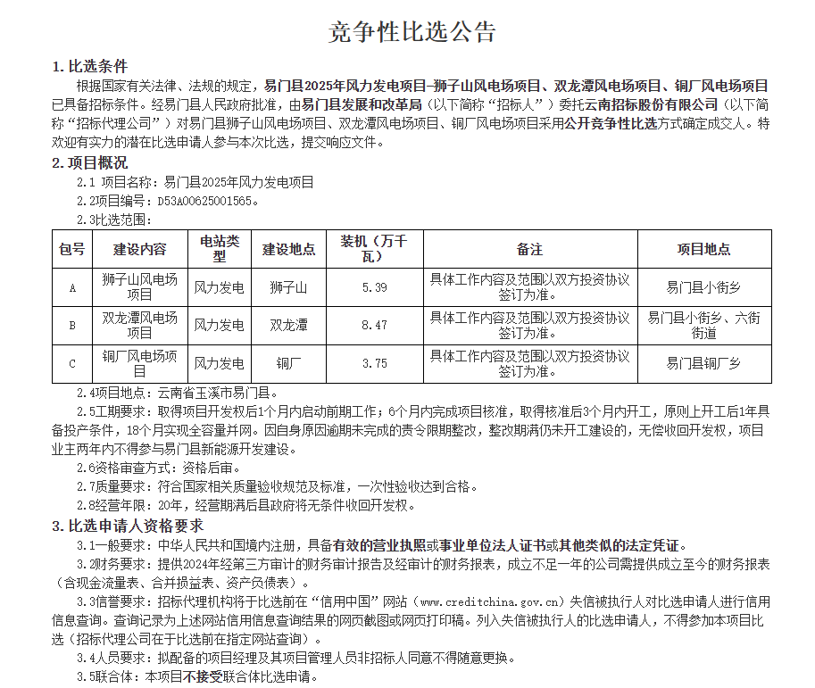 北极星风力发电网获悉,9月16日,狮子山风电场项目、双龙潭风电场项目、铜厂风电场项目竞争性比选公告发布。公告显示,狮子山风电场项目位于易门县小街乡,装机容量53.9MW;双龙潭风电场项目位于易门县小街乡、六街街道,装机容量84.7MW;铜厂...