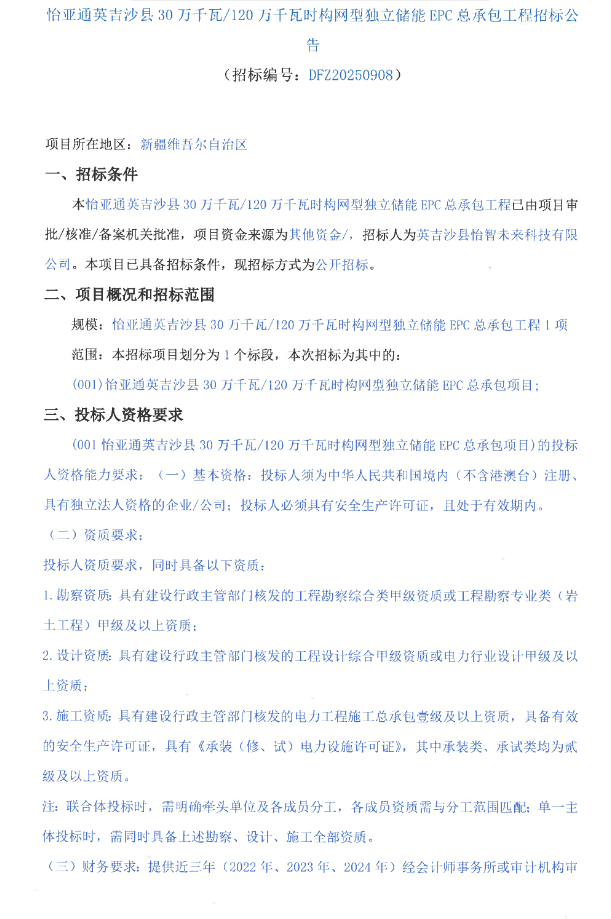 北极星储能网讯:9月18日,新疆喀什地区怡亚通英吉沙县30万千瓦/120万千瓦时构网型独立储能EPC总承包工程招标公告发布,招标人为英吉沙县怡智未来科技有限公司,项目资金为自筹,项目位于新疆喀什地区英吉沙县境内。项目规划新建一座300MW/...