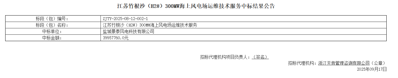 北极星风力发电网获悉,近日,《江苏竹根沙(H2#)300MW海上风电场运维技术服务中标结果公告》发布。公告显示,该项目中标人为盐城景泰风电科技有限公司,中标金额:39957760.0元。招标公告阅读:江苏300MW海上风电项目运维招标!...