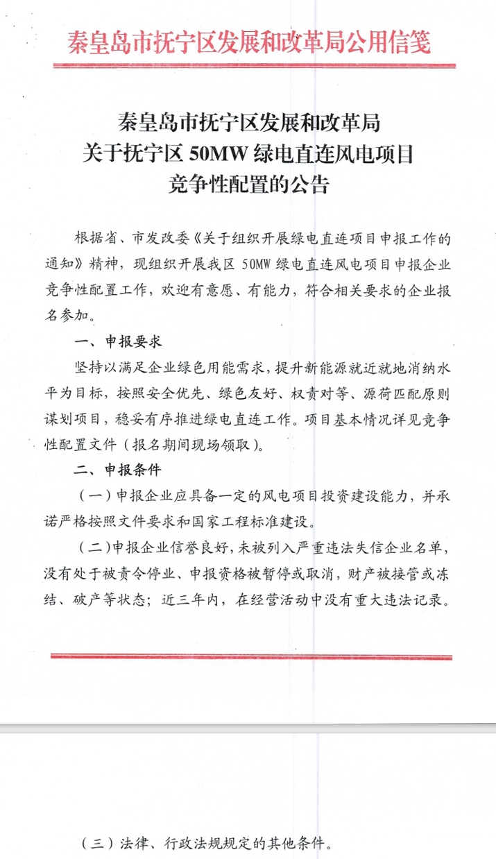 北极星风力发电网获悉,9月16日,河北抚宁区发展和改革局发布抚宁区关于50MW绿电直连风电项目竞争性配置的公告。公告显示,根据省、市发改委《关于组织开展绿电直连项目申报工作的通知》精神,现组织开展抚宁区50MW绿电直连风电项目申报企业竞争性...