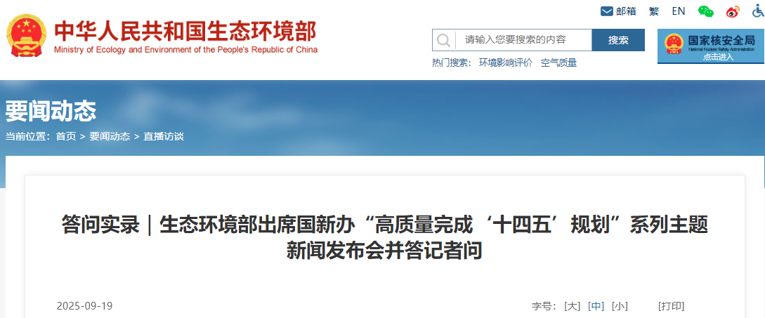 国务院新闻办公室于2025年9月19日上午10时30分举行“高质量完成‘十四五’规划”系列主题新闻发布会,请生态环境部部长黄润秋、生态环境部副部长于会文、生态环境部副部长郭芳、生态环境部副部长李高介绍以生态环境高水平保护推动高质量发展情况。...