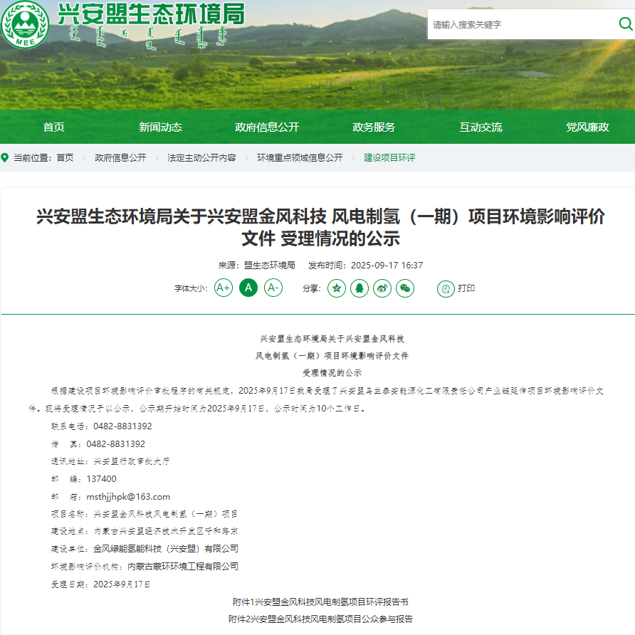 9月17日,兴安盟生态环境局官网发布兴安盟生态环境局关于兴安盟金风科技风电制氢(一期)项目环境影响评价文件受理情况的公示。信息显示,建设单位为金风绿能氢能科技(兴安盟)有限公司,建设内容及规模:本次一期项目建设1座电解水制氢厂房、1座氢气气...