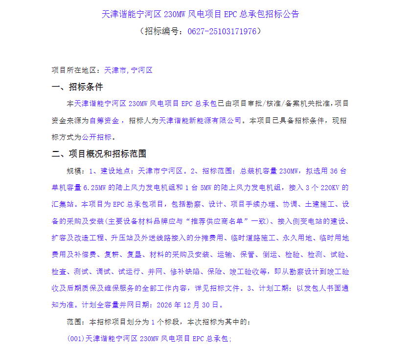 9月18-19日,中国招标投标公共服务平台发布两个风电EPC项目招标,总装机规模240MW,涉及风电机组39台套。详情如下:...