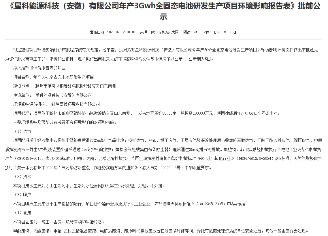 北极星储能网获悉,9月12日,安徽省滁州市生态环境局发布“星科能源科技(安徽)有限公司年产3GWh全固态电池研发生产项目环境影响报告表批前公示”信息。信息显示,星科能源科技(安徽)有限公司年产3GWh全固态电池研发生产项目一期占地面积约80...