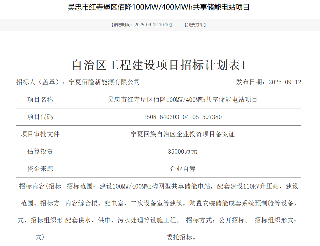 北极星储能网讯:9月12日,宁夏吴忠市红寺堡区佰隆100MW/400MWh共享储能电站项目招标计划表发布。项目估算投资35000万元,招标人为宁夏佰隆新能源有限公司。项目拟建设100MW/400MWh构网型共享储能电站,配套建设110kV升...