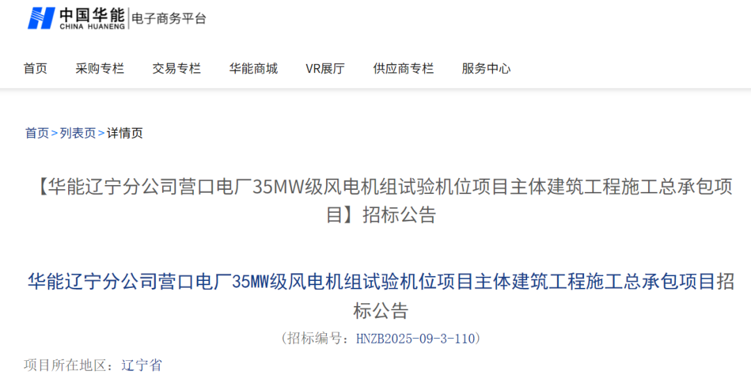 北极星风力发电网获悉,9月9日,中国华能电子商务平台发布《华能辽宁分公司营口电厂35MW级风电机组试验机位项目主体建筑工程施工总承包项目招标公告》。公告显示,为了满足深远海大容量风电机组的测试需求,提升我国在风电领域的技术竞争力,在辽宁省营...