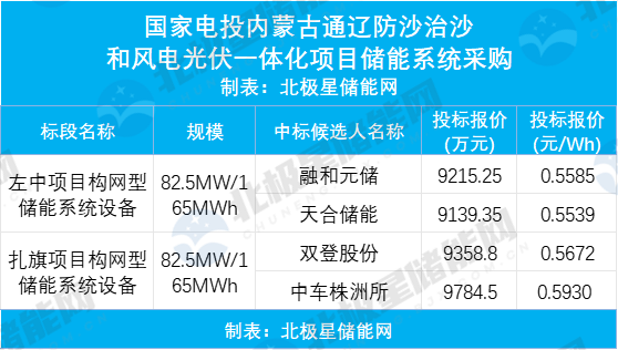 北极星储能网讯:9月12日,国家电投通辽防沙风光配套储能系统采购中标结果公示,融和元储与双登股份分别以9215.25万元和9358.80万元中标82.5MW/165MWh构网型储能系统采购。中标候选人公示显示,两个标段共有四家中标候选人,融...