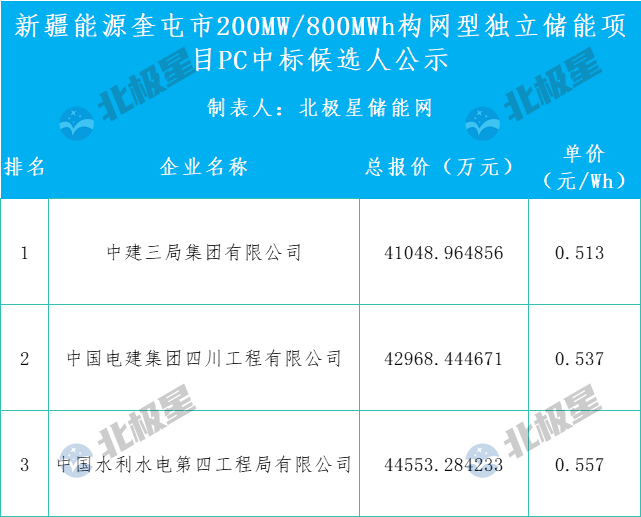 北极星储能网获悉,9月12日,新疆能源奎屯市20万千瓦/80万千瓦时构网型独立储能项目PC总承包-中标候选人公示。第一中标候选人为中建三局集团有限公司,投标报价41048.964856万元,折合单价0.513元/Wh;第二中标候选人为中国电...