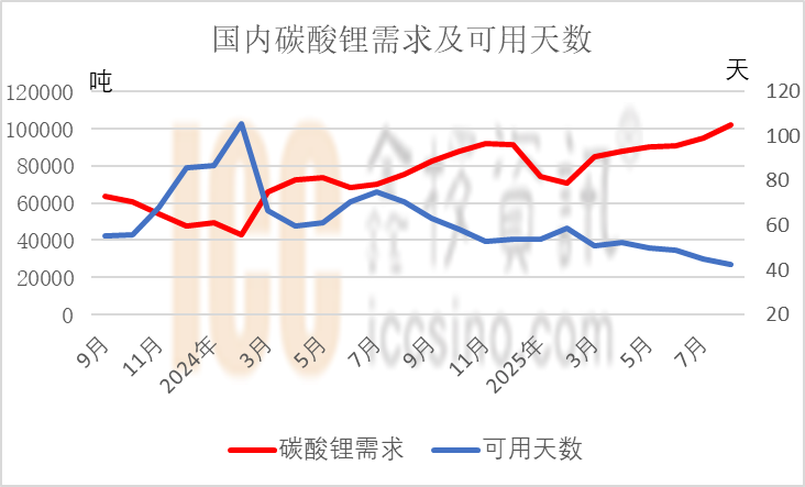 据ICC鑫椤锂电数据库统计,2025年8月份国内碳酸锂总需求量达到10.2万吨,环比增长7.49%,再创历史新高。虽然目前碳酸锂库存仍在14万吨之上,但近半年来可用天数持续下降,价格弹性随之增强。从具体需求看,磷酸铁锂对碳酸锂需求环比增幅达...