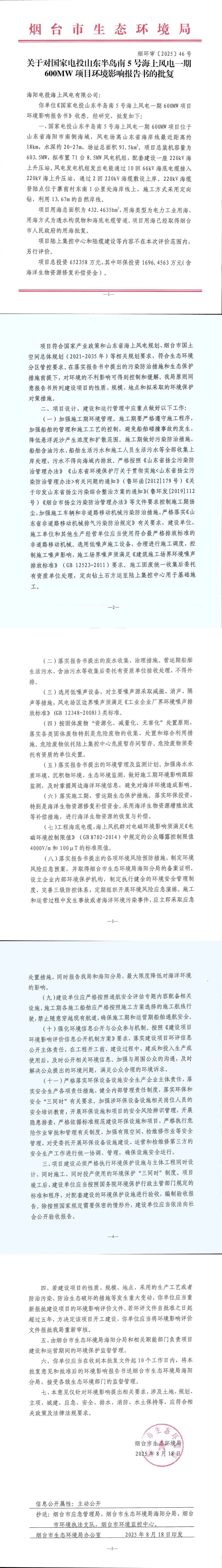 2025年8月,烟台市生态环境局发布《关于对国家电投山东半岛南5号海上风电一期600MW项目环境影响报告书的批复》。根据批复,国家电投山东半岛南5号海上风电一期600MW项目位于山东省海阳市南侧海域,风电场离山东省海岸线最近距离约18km,...