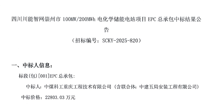 北极星储能网获悉,9月15日,四川川能智网崇州市100MW/200MWh电化学储能电站项目EPC总承包中标结果公告。中煤科工重庆工程技术有限公司、中建五局安装工程有限公司联合体以22803.03万元中标该项目,折合单价1.14元/Wh。招标...