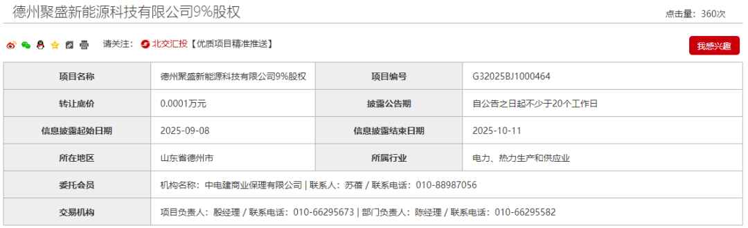 9月8日,中国电建集团江西省电力建设有限公司转让德州聚盛新能源科技有限公司9%股权,转让底价0.0001万元,转让公司注册资本2088.80万元,经营范围包括电力行业高效节能技术研发;光伏发电设备租赁;资源再生利用技术研发;工程管理服务;技...