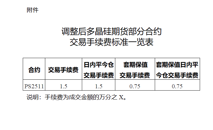 9月9日,广州期货交易所发布关于调整工业硅、多晶硅期货相关合约交易手续费标准及交易限额的通知,通知指出,自2025年9月11日交易时起,多晶硅期货PS2511合约的交易手续费标准调整为成交金额的万分之一点五,日内平今仓交易手续费标准调整为成...