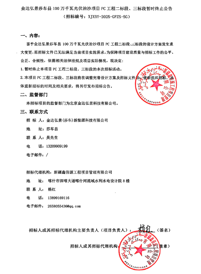 9月1日,中国招标投标网发布《金达弘景莎车县100万千瓦光伏治沙项目PC工程二标段、三标段暂时终止公告》。公告表示,鉴于金达弘景莎车县100万千瓦光伏治沙项目PC工程二标段、三标段的设计方案发生重大变更,原招标文件已无法满足当前项目实施需求...