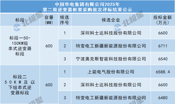 8月29日,中国华电集团有限公司相关项目工程中国华电集团有限公司2025年第二批逆变器框架采购批次评标结果公示。标段一(50-150KW组串式逆变器标段)中标候选人:深圳科士达科技股份有限公司、特变电工新疆新能源股份有限公司、宁波奥克斯智能...