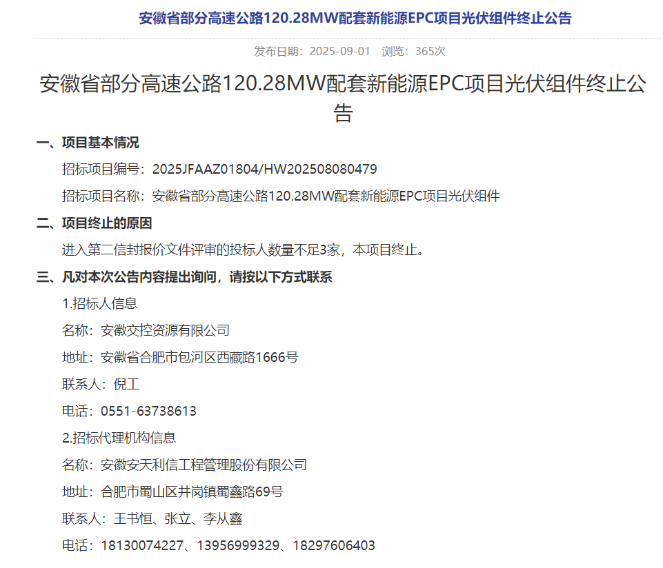 9月1日,安徽省部分高速公路120.28MW配套新能源EPC项目光伏组件终止公告发布。公告显示,项目终止的原因为进入第二信封报价文件评审的投标人数量不足3家,本项目终止。该项目招标公告显示,本次招标共划分为1个标包,共对安徽省部分高速公路1...