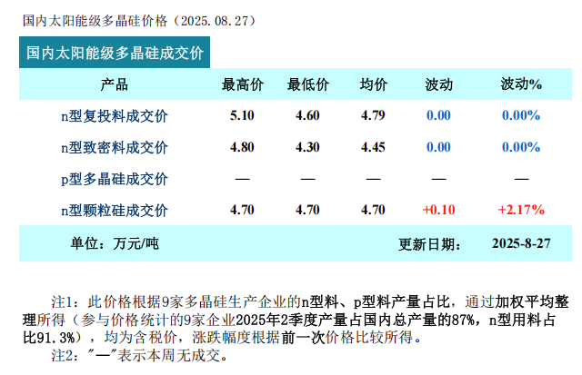 8月27日,硅业分会公布最新多晶硅价格。本周多晶硅n型复投料成交价格区间为4.6-5.1万元/吨,成交均价为4.79万元/吨,周环比持平。n型颗粒硅成交均价为4.70万元/吨,周环比上涨2.17%。本周多晶硅市场签单量环比缩减,主流签单企业...