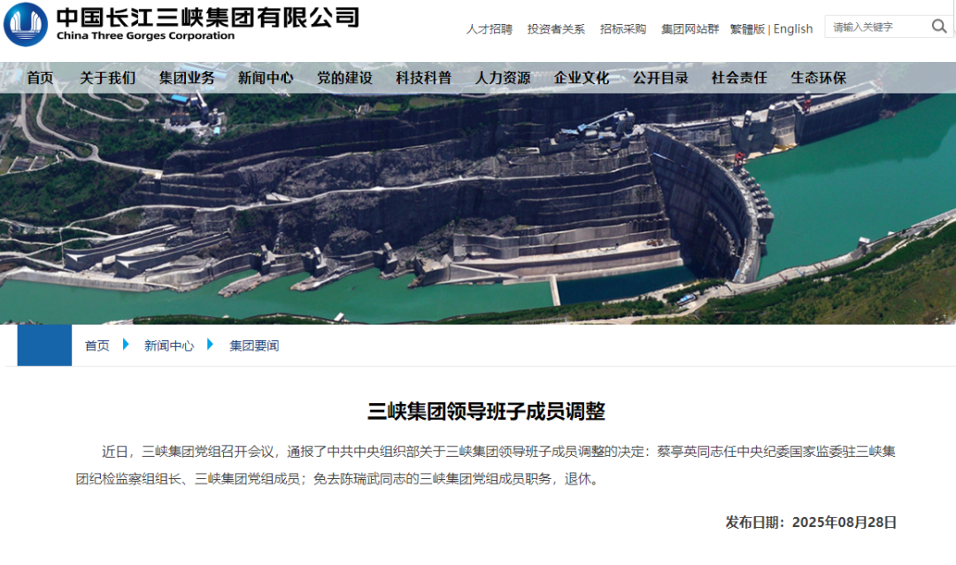 据三峡集团官方网站8月28日消息 近日,三峡集团党组召开会议,通报了中共中央组织部关于三峡集团领导班子成员调整的决定:蔡亭英同志任中央纪委国家监委驻三峡集团纪检监察组组长、三峡集团党组成员;免去陈瑞武同志的三峡集团党组成员职务,退休。...