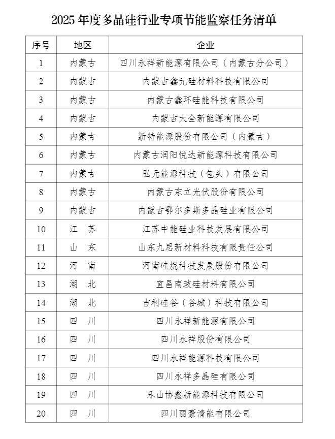 8月1日,工信部印发2025年度多晶硅行业专项节能监察任务清单的通知。通知要求,各地工信部在工业节能监察过程中,要贯彻落实《国务院办公厅关于严格规范涉企行政检查的意见》,进一步规范工业节能监察程序措施,切实减轻企业负担,并于2025年9月3...