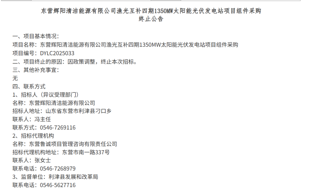 日前,东营辉阳清洁能源有限公司渔光互补四期1350MW太阳能光伏发电站项目组件采购宣布终止,终止原因为政策调整。根据招标公告,该项目装机容量为975MWp,光伏支架按照组件倾角45°时最低点高程为3.7m设计,项目容配比为1.3:1。建设地...