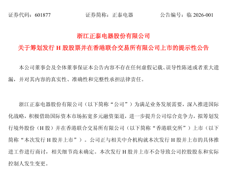 北极星储能网获悉,1月6日晚,正泰电器公告称,为满足业务发展需要,深入推进国际化战略,积极借助国际资本市场拓宽多元融资渠道,进一步提升公司综合竞争力,拟筹划发行境外股份(H股)并在香港联合交易所有限公司(以下简称“香港联交所”)上市(以下简...