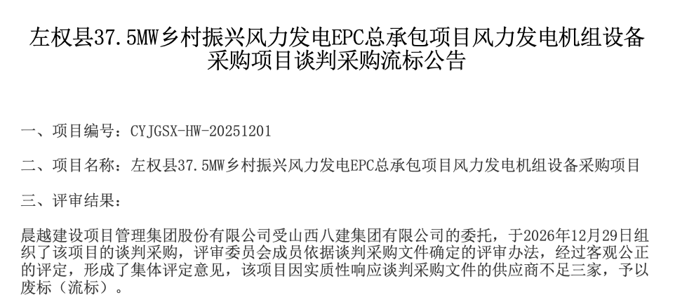 北极星风力发电网获悉,近日,山西左权县37.5MW乡村振兴风力发电EPC总承包项目发布机组采购因实质性响应供应商不足三家被废标(流标)。据悉,左权县37.5MW乡村振兴风力发电项目属分散式风电,招标人为左权县弘耀新能源科技有限公司;项目位于...
