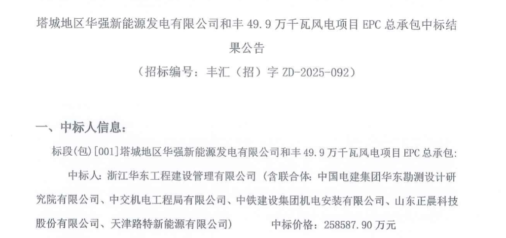 北极星风力发电网获悉,近日,塔城地区华强新能源发电有限公司和丰49.9万千瓦风电项目EPC总承包中标结果公示。公告显示,中标人为浙江华东工程建设管理有限公司(含联合体:中国电建集团华东勘测设计研究院有限公司、中交机电工程局有限公司、中铁建设...