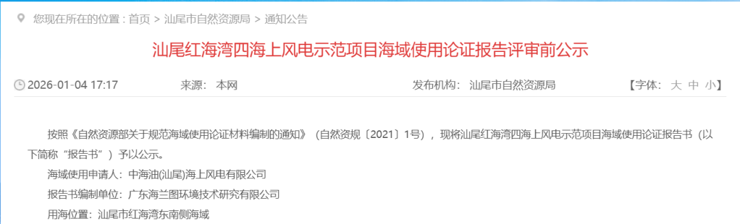 2026年1月4日,汕尾市自然资源局发布《汕尾红海湾四海上风电示范项目海域使用论证报告评审前公示》。根据公示,汕尾红海湾四海上风电示范项目位于广东省汕尾市红海湾东南侧海域,场址面积约75km²,风电场场址水深在34m~42m之间,距离陆地最...