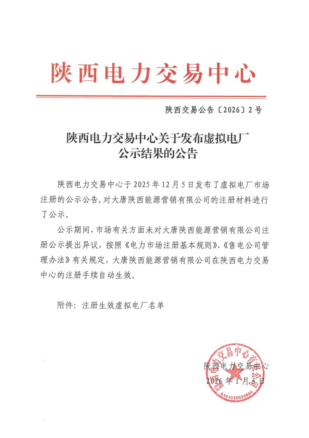 北极星电力市场网获悉,2026年1月5日,陕西电力交易中心发布虚拟电厂公示结果的公告。公示期间,市场有关方面未对大唐陕西能源营销有限公司注册公示提出异议,按照《电力市场注册基本规则》、《售电公司管理办法》有关规定,大唐陕西能源营销有限公司在...