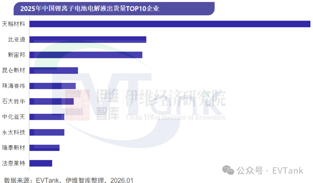 近日,研究机构EVTank联合伊维经济研究院共同发布了《中国锂离子电池电解液行业发展白皮书(2026年)》。EVTank在白皮书中披露了2025年中国锂离子电池电解液出货量TOP10企业名单,其中天赐材料以72万吨的出货量排名第一,连续多年...