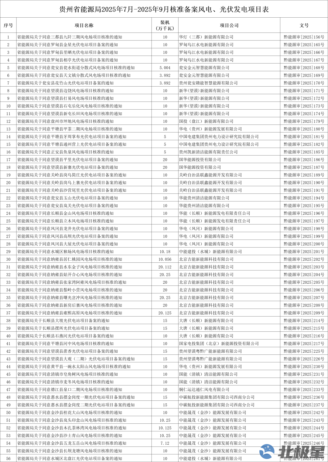 根据《省人民政府关于印发贵州省企业投资项目核准和备案管理办法的通知》(黔府发〔2018〕第7号),按照程序,贵州省能源局2025年7月-2025年9月核准备案风电、光伏发电项目56个,现将有关情况公布如下。