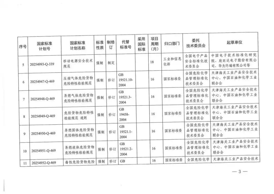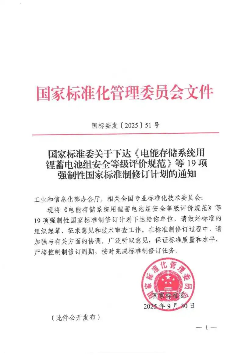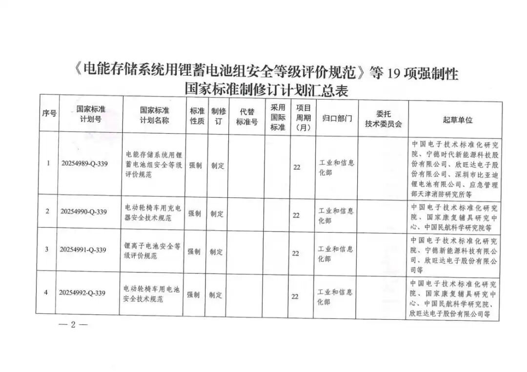 其中,《电能存储系统用锂蓄电池组安全等级评价规范》由中国电子技术标准化研究院、宁德时代新能源科技股份有限公司、欣旺达电子股份有限公司、深圳市比亚迪锂电池有限公司、应急管理部天津消防研究所等单温参与起草,为强制性标准,计划号20254989-Q-339。