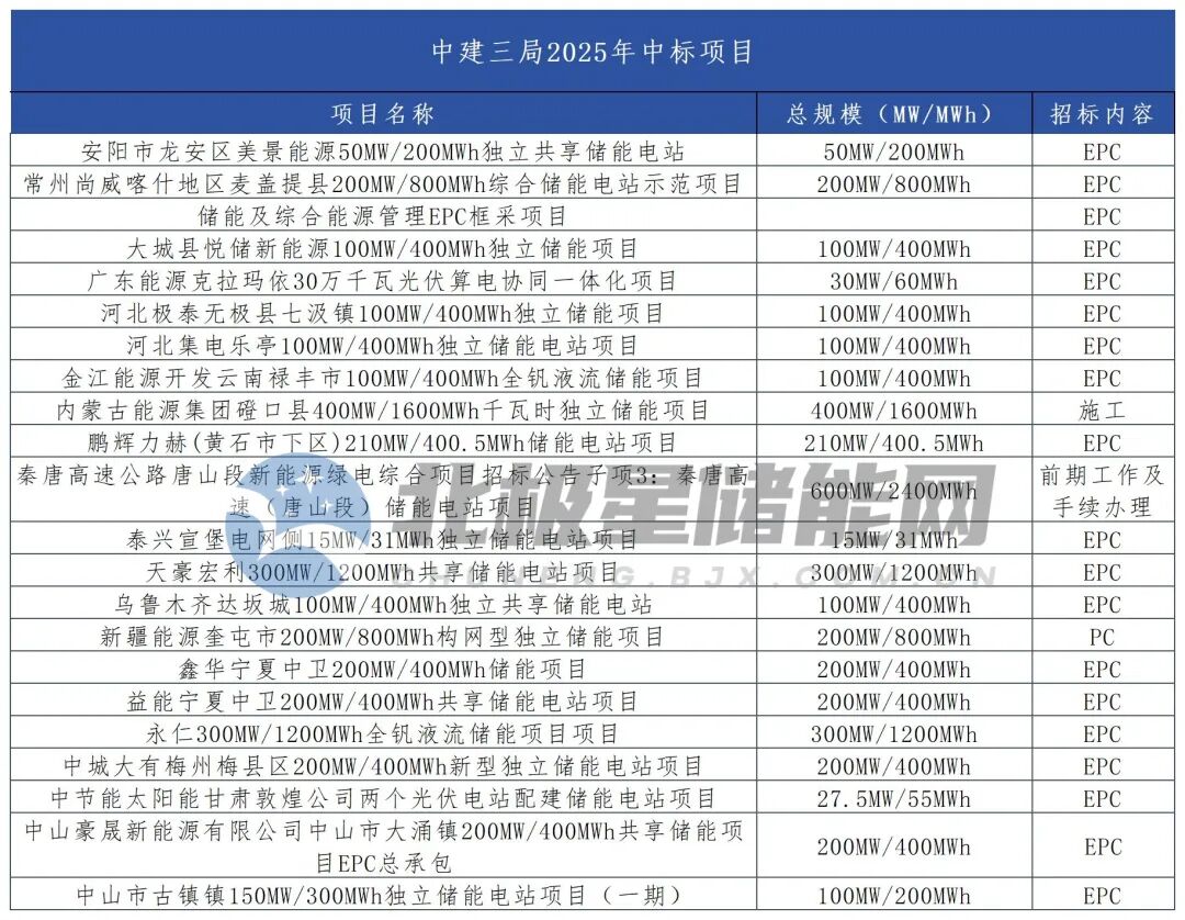 中建三局2025年单独中标11个储能项目,涵盖9个EPC项目,1个施工项目及1个前期工作与手续办理项目,单独中标规模达2.44GW/8.26GWh,对应金额62.94亿元;此外,中建三局联合中标11个储能EPC项目,规模为1.292GW/4.285GWh,中标金额38.08亿元。