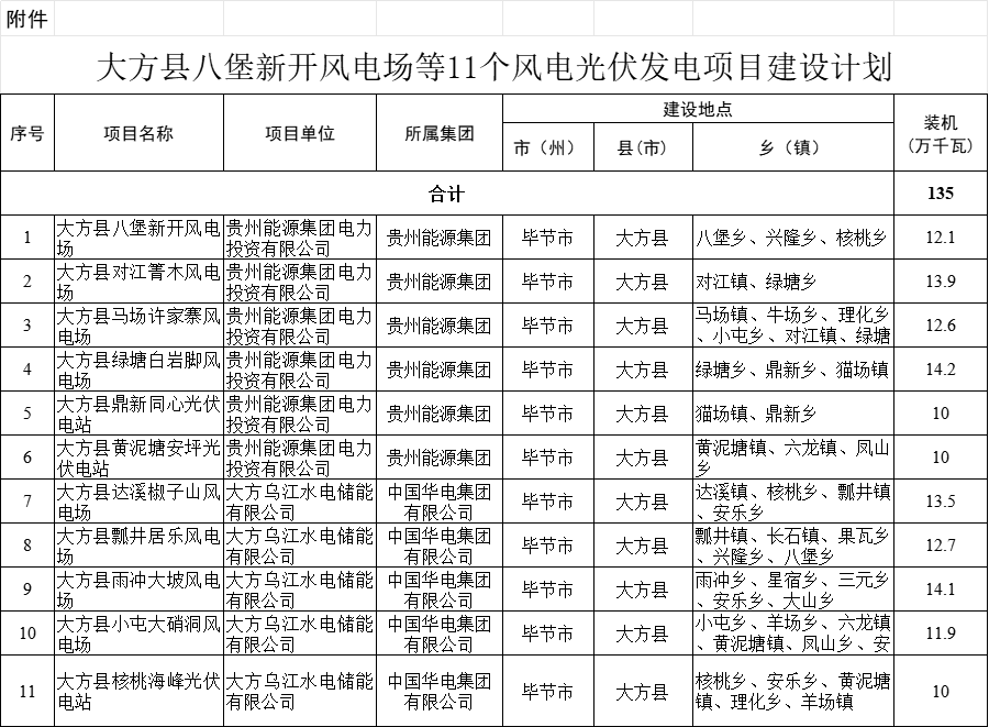 9月2日,贵州省能源局发布《关于下达大方县八堡新开风电场等11个风电光伏发电项目建设计划的通知》,此次共下发了11个风、光项目清单,总装机规模达1350MW,其中光伏项目装机300MW,风电项目装机1050MW。