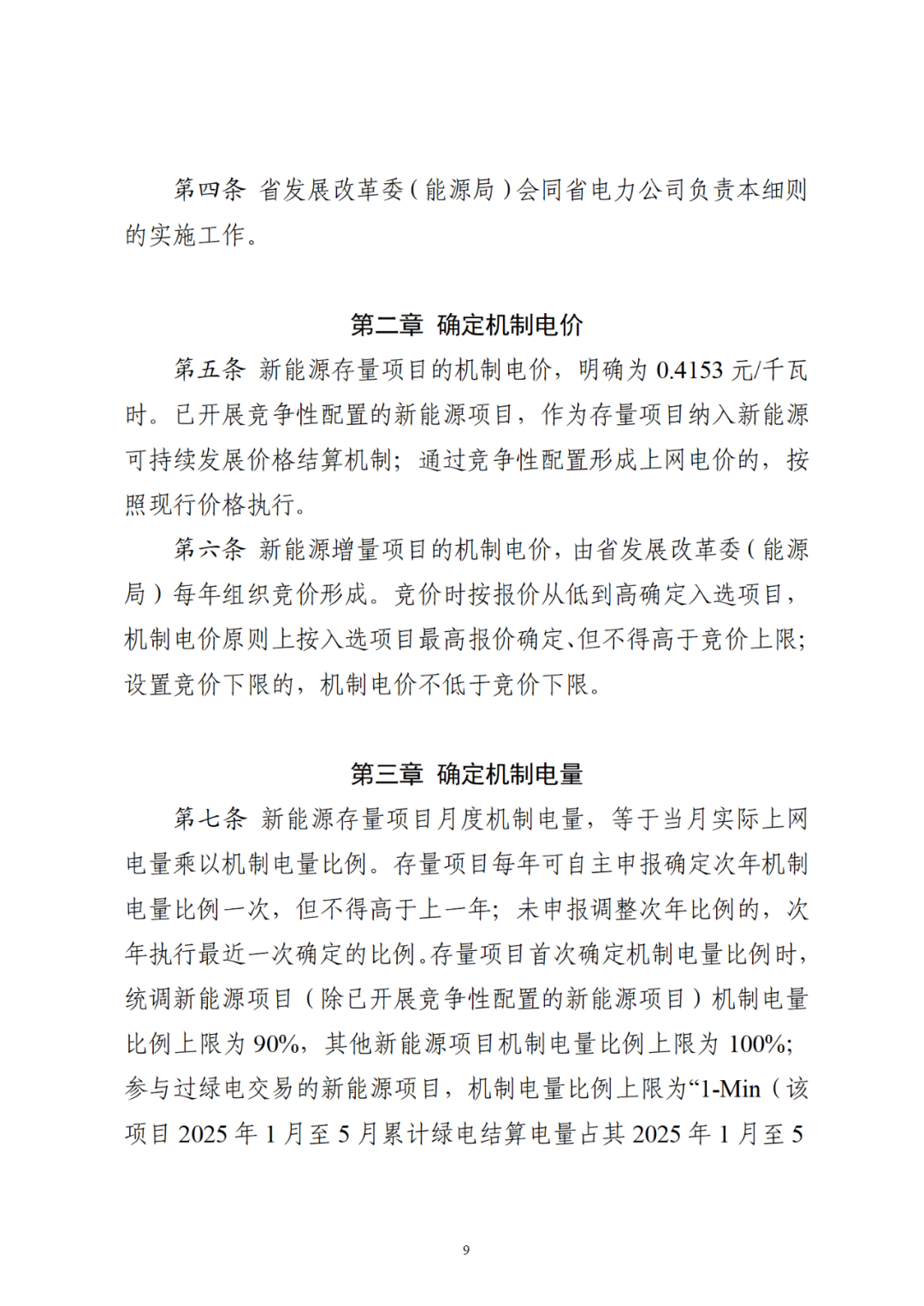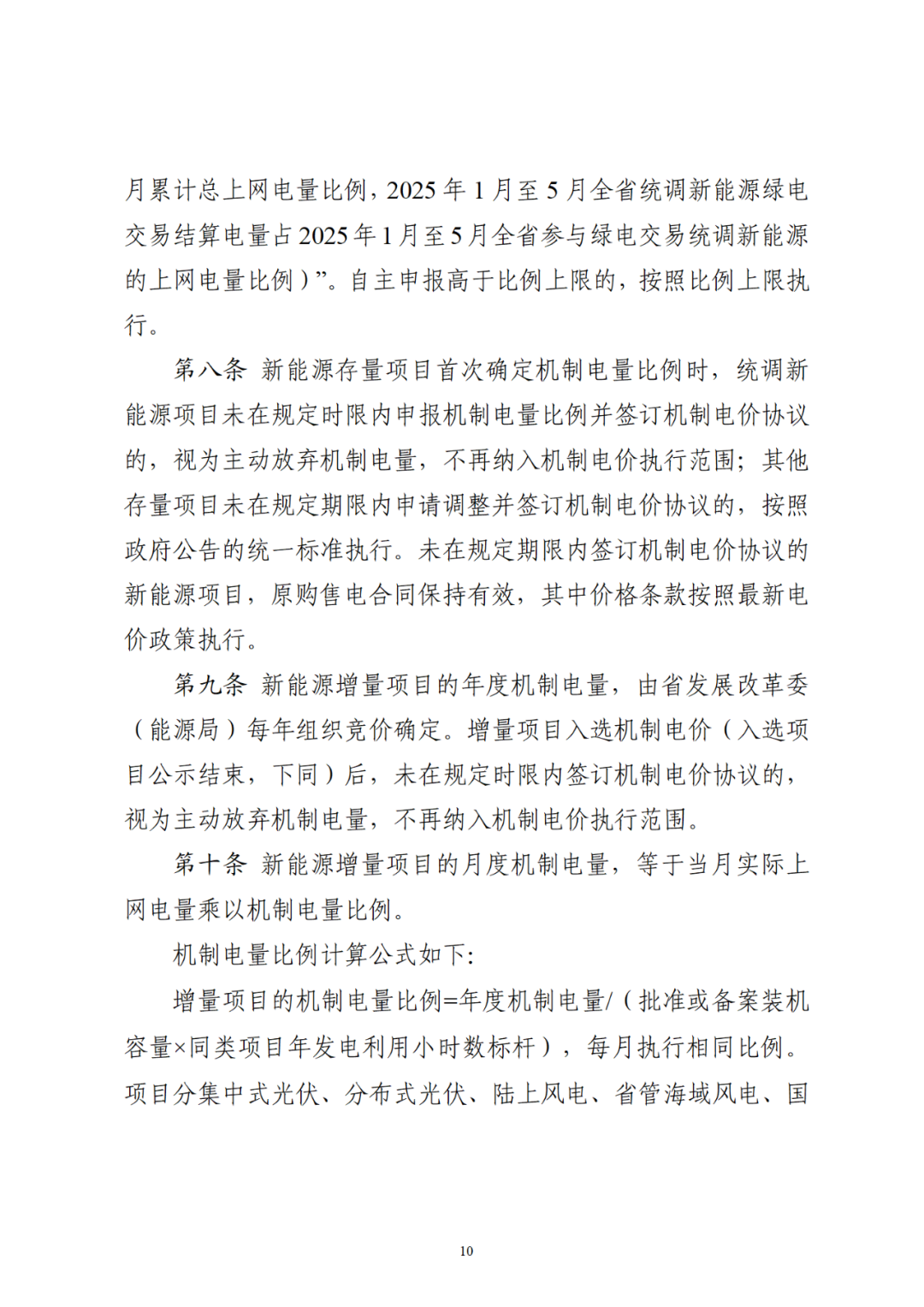 2.机制电量,根据机制电量比例乘实际上网电量确定。项目每年可自主确定次年机制电量比例一次,但不得高于上一年;新能源存量项目首次确定机制电量比例时,统调新能源项目(除已开展竞争性配置的新能源项目)不得高于90%,其他新能源项目不得高于100%;参与过绿电交易的新能源项目,机制电量比例上限根据绿电交易结算电量占其总上网电量比例计算,并设置比例上限最小值。