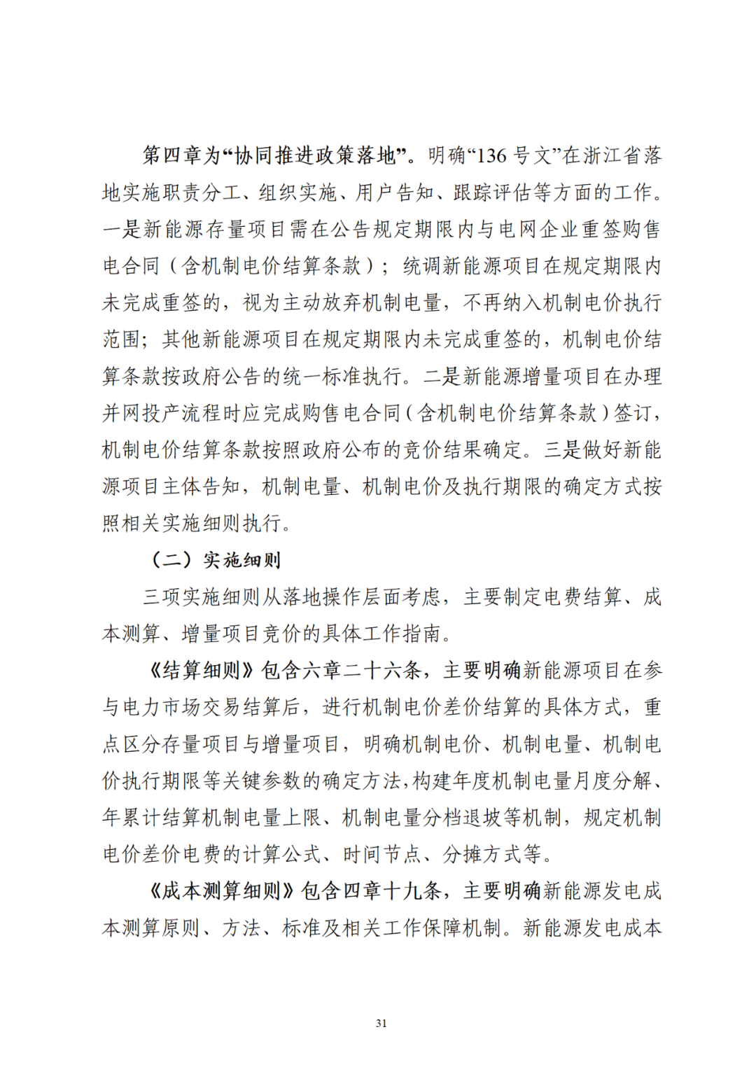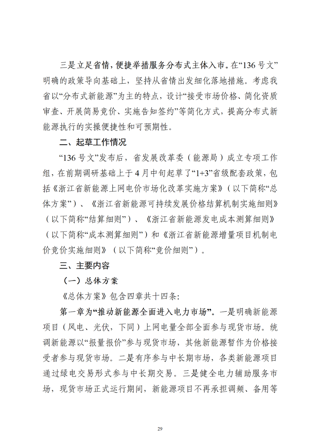 根据披露,本次征求意见稿共涉及“1+3”省级配套政策,包括《浙江省新能源上网电价市场化改革实施方案》(以下简称“总体方案”)、《浙江省新能源可持续发展价格结算机制实施细则》(以下简称“结算细则”)、《浙江省新能源发电成本测算细则》(以下简称“成本测算细则”)和《浙江省新能源增量项目机制电价竞价实施细则》(以下简称“竞价细则”)。